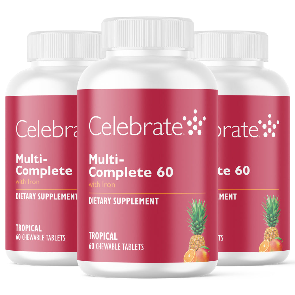 Celebrate Multi-Complete 60 contiene tutte le vitamine e i minerali in un'opzione a dose divisa di due al giorno, i pazienti devono solo aggiungere il calcio. Questo multivitaminico ha il contenuto di ferro più alto di qualsiasi multivitaminico bariatrico sul mercato, rendendolo perfetto per il paziente che ha subito una procedura di anastomosi singola e richiede più ferro. Questo multivitaminico bariatrico soddisfa gli standard ASMBS di multivitaminico e ferro dopo l'intervento chirurgico bariatrico e include anche un livello più alto di vitamina B-12 (1000 mcg). Questa formula integrata offre la massima biodisponibilità poiché abbiamo selezionato con cura ogni forma di vitamina e minerale per migliorare l'interazione e l'assorbimento. MC-60 è disponibile in forma masticabile (gusto Tropical) o in capsule.